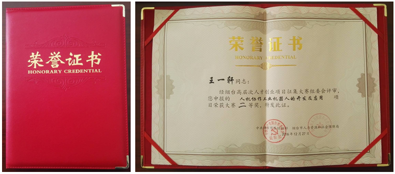 2016年12月27日,煙臺(tái)市高層次人才創(chuàng)新創(chuàng)業(yè)項(xiàng)目大賽在市中心大酒店隆重舉行,經(jīng)過(guò)激烈角逐,我公司王一軒博士申報(bào)的《人機(jī)協(xié)作機(jī)器人的開(kāi)發(fā)與應(yīng)用》在165個(gè)參賽項(xiàng)目中脫穎而出,榮獲大賽二等獎(jiǎng)(共5名)